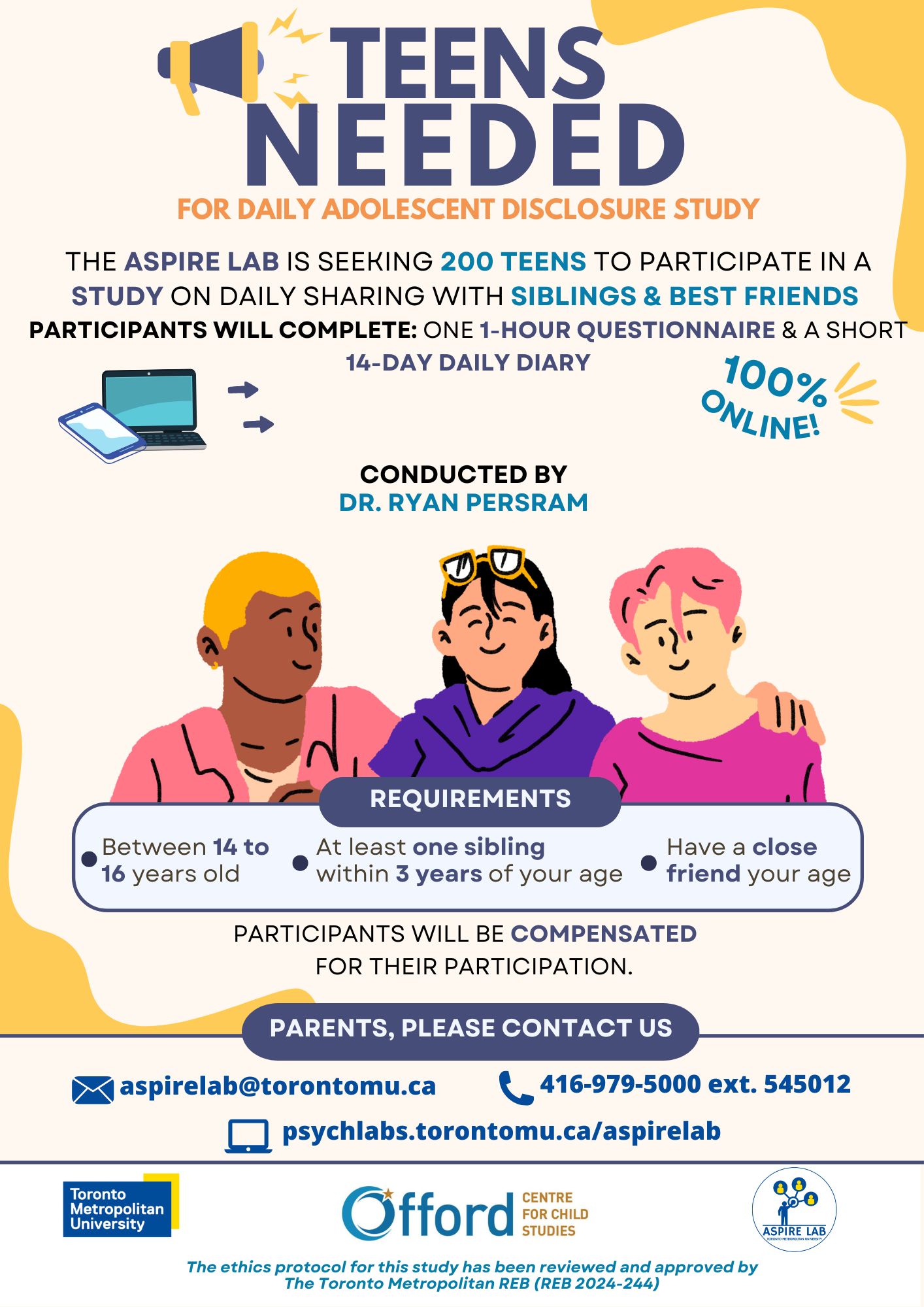 We're Recruiting! The ASPIRE Lab at Toronto Metropolitan University is recruiting 200 Canadian teens for a 2-part study on youth disclosure and information sharing with siblings and friends! It's completely online! For more info, parents can contact us at aspirelab@torontomu.ca. The ethics protocol for this study has been reviewed and approved by the Toronto Metropolitan Research Ethics Board (REB 2024-244).